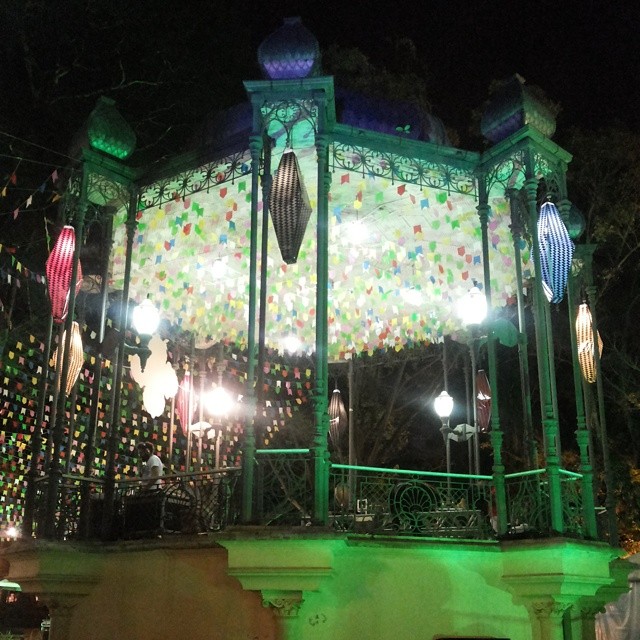 Uma praça, um coreto, uma pequena igreja com sua torre